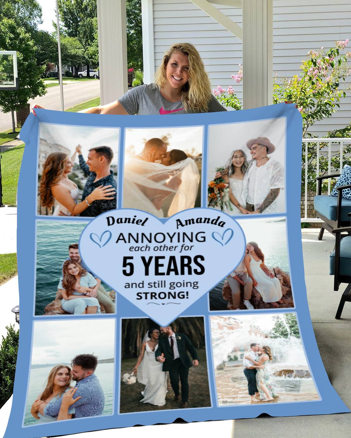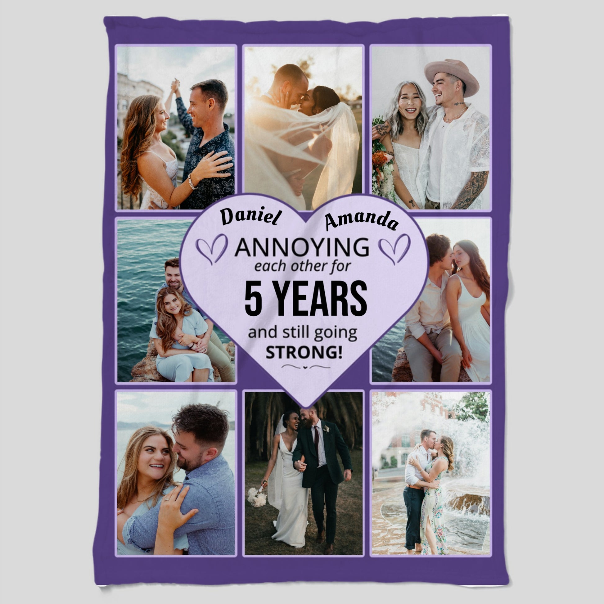 This is a Personalized Photo Blanket that allows you to add your own photos, your names and the number of years you’ve been together!